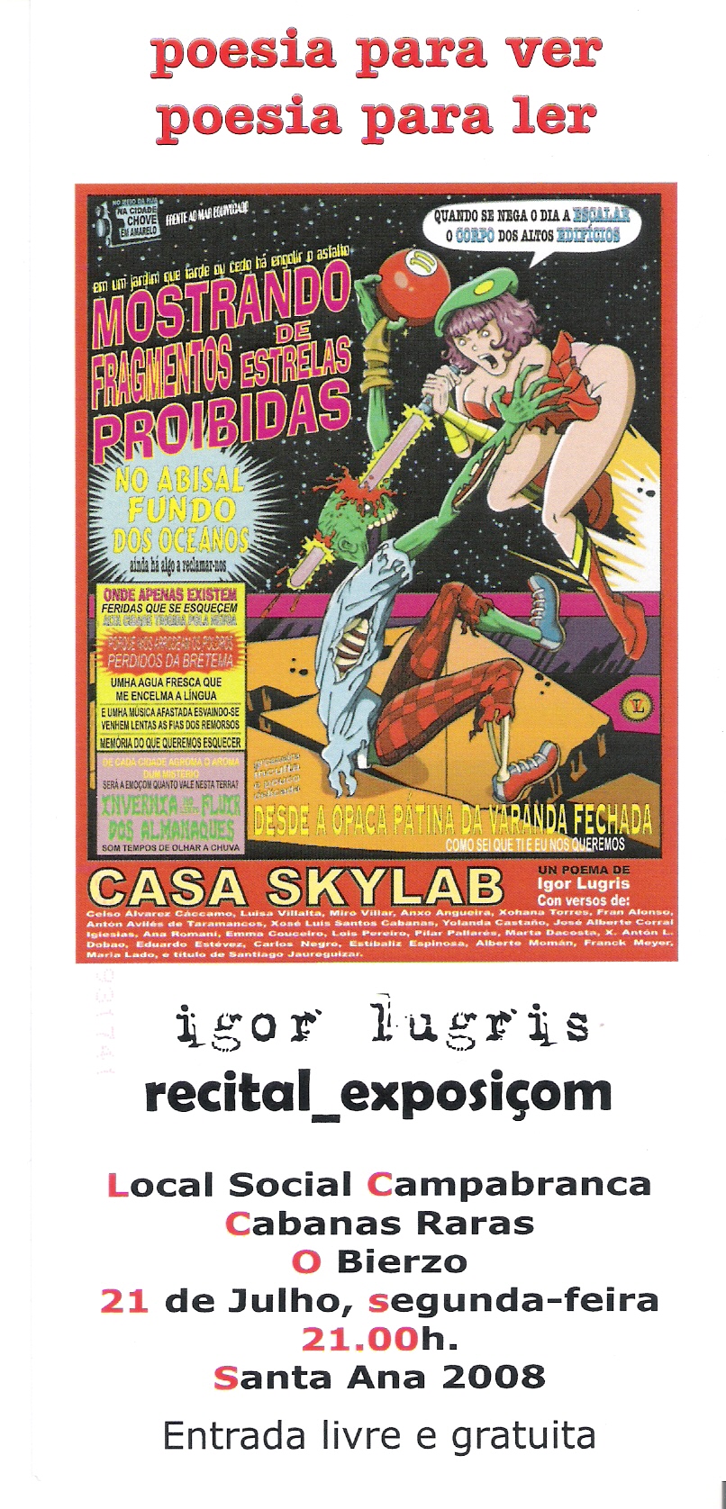 En tanto que el falaba, na penumbra das butacas eu perfilaba a seguinte sentenza mental: se houbesemos dividir os poetas e escritores entre aqueles que aspiran a vivir pasivamente do que escriben [funcionarios, no peor sentido do termo; autocompracentes, no peor sentido do adxectivo] e aqueloutros que aspiran a vivir activamente do que escriben, os cuestionadores, os que argallan, os que non toman iniciativas de segunda man… Igor vai estar dentro destes últimos, e diso non me cabe dúbida. En moitos sentidos, o seu xeito de estar no mundo é concibido coma un combate e é esa a actitude, levada coa intelixencia e o humor con que el o fai, a garantía dunha dose fabulosa de experimento + ironía. Esas pequenas doses en forma de artefacto, colante, convocatoria cibernética, colaxe ou cartaz que lle vimos coñecendo dende hai xa varios anos.