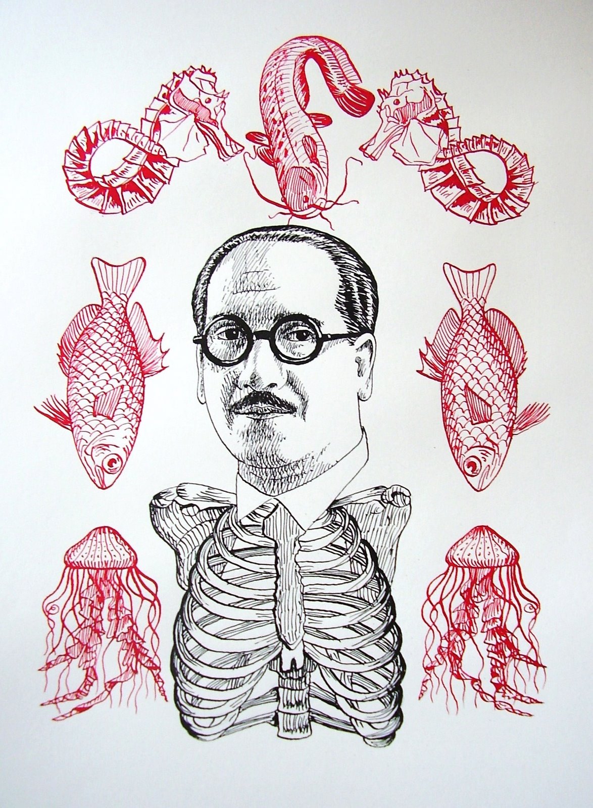 Hai algúns anos, Pablo debuxaba a tinta negra e carmesí esta especie de collages diseccionados. Ten moitos, algúns cheos de lóxicas deliciosas, é dicir, dadaístas. Coido que neles hai algo do xermolo do que logo foron os Hiperhíbridos [Eds. El Gaviero, 2011] e o proxecto Disecciones, aínda no forno.
