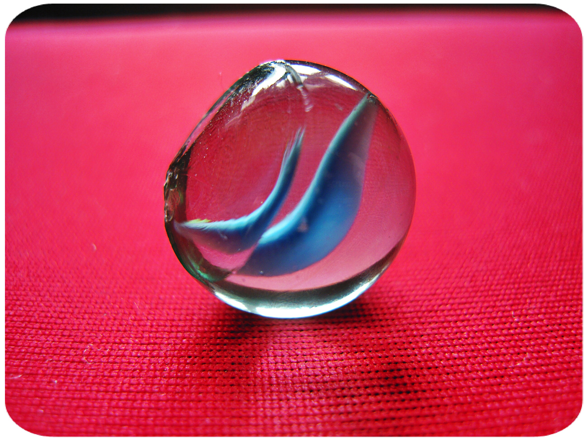 Teño canicas compradas a cativos franceses nun mercado de segunda man. Unha é grande con furados, que son os accidentes xeográficos, ocorridos nalgún xogo polo chan; e con franxas azuis en espiral que son os océanos.