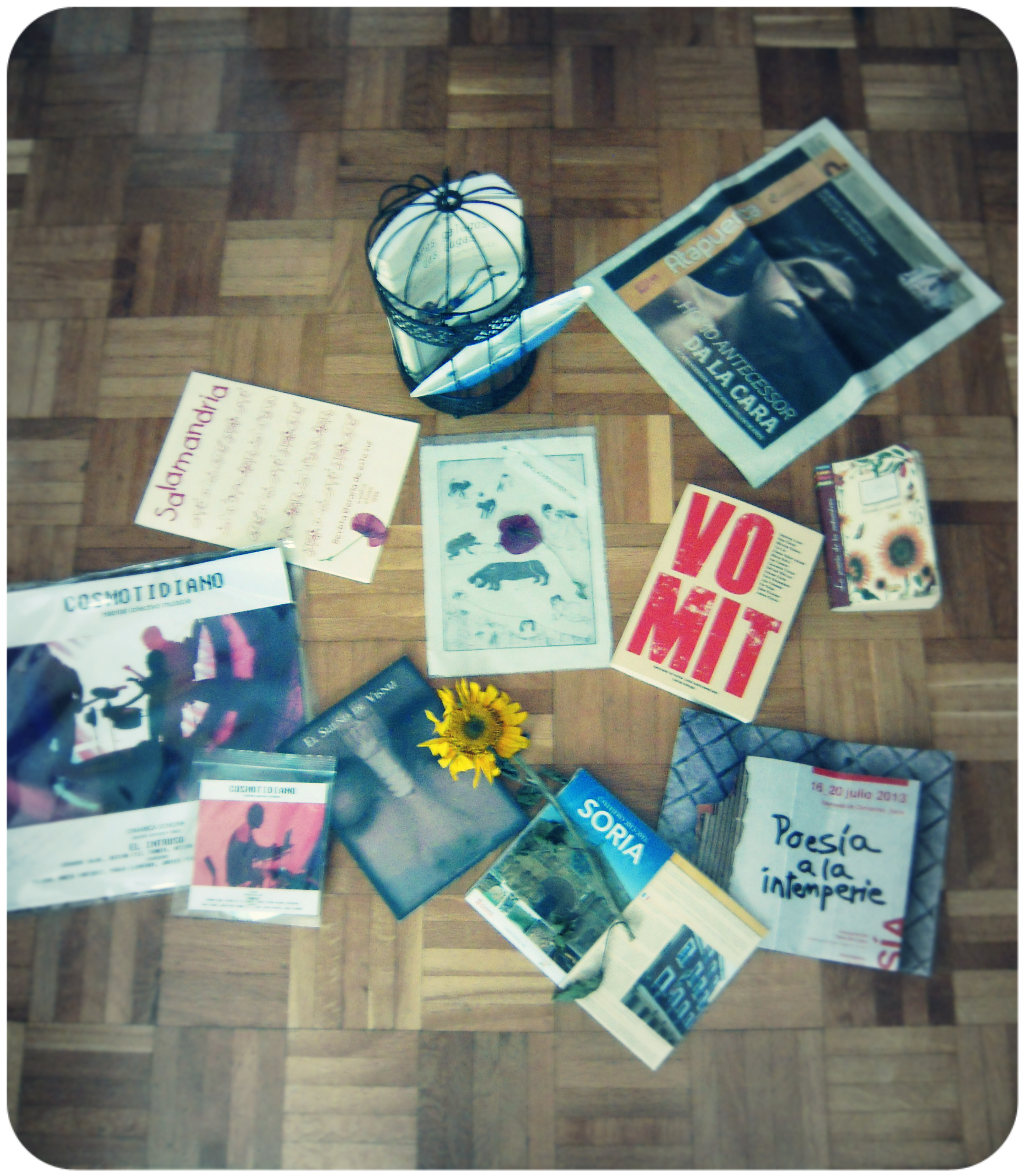 VI Feria del Libro de Soria. Botín: barquiño do Gaviero, El sueño de Visnu, de David Meza, Vomit, gravado en fragmento dun enxoval de liño obra de Laia Arqueros, vella Salamandria sobre «Formigas», xornal de Atapuerca, puntas de frecha de sílex, venus de Willendorf, mapoulas secas roubadas dos trigais de Burgos, xirasois sisados dos campos palentinos, Cosmotidiano de El Intruso, plano de Soria, sobreciño de zucre de Mantequerías York, libro/libreta para tomar apuntes do natural [para Y.], Gaya Nuño, aventura en Tardelcuente…