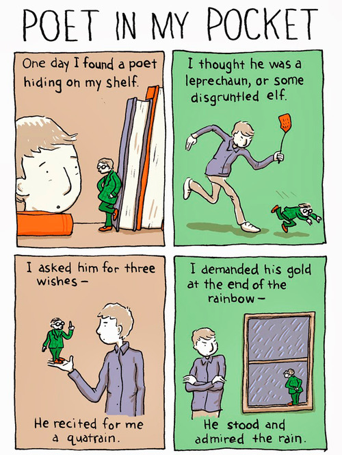 Un día atopei un poeta agochado no meu andel. Crin que era un trasno ou algún elfo contrariado. Pedinlle tres desexos: el declamoume un cuarteto. Pedinlle o ouro ao final do arco da vella: ficou quieto, admirando a choiva.