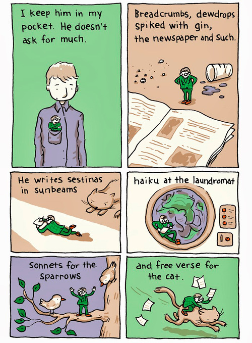 Gárdoo no peto. Moito non me pide. Farangullas, gotas de orballo cun chisco de gin, o xornal e cousas así. Escribe sextinas nas raiolas; haikus na lavadora; sonetos para os pardais; e verso libre para o gato.