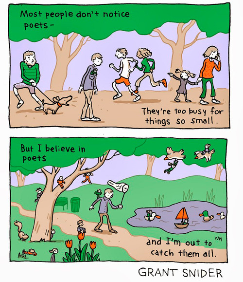 Os poetas como criaturiñas do fogar. Como bolboretas. Como seres que escriben aínda sextinas e sonetos. Como libélulas delicadas, hipersensibles. Amantes dos animais. Con lentes. Despistados. Diminutos.