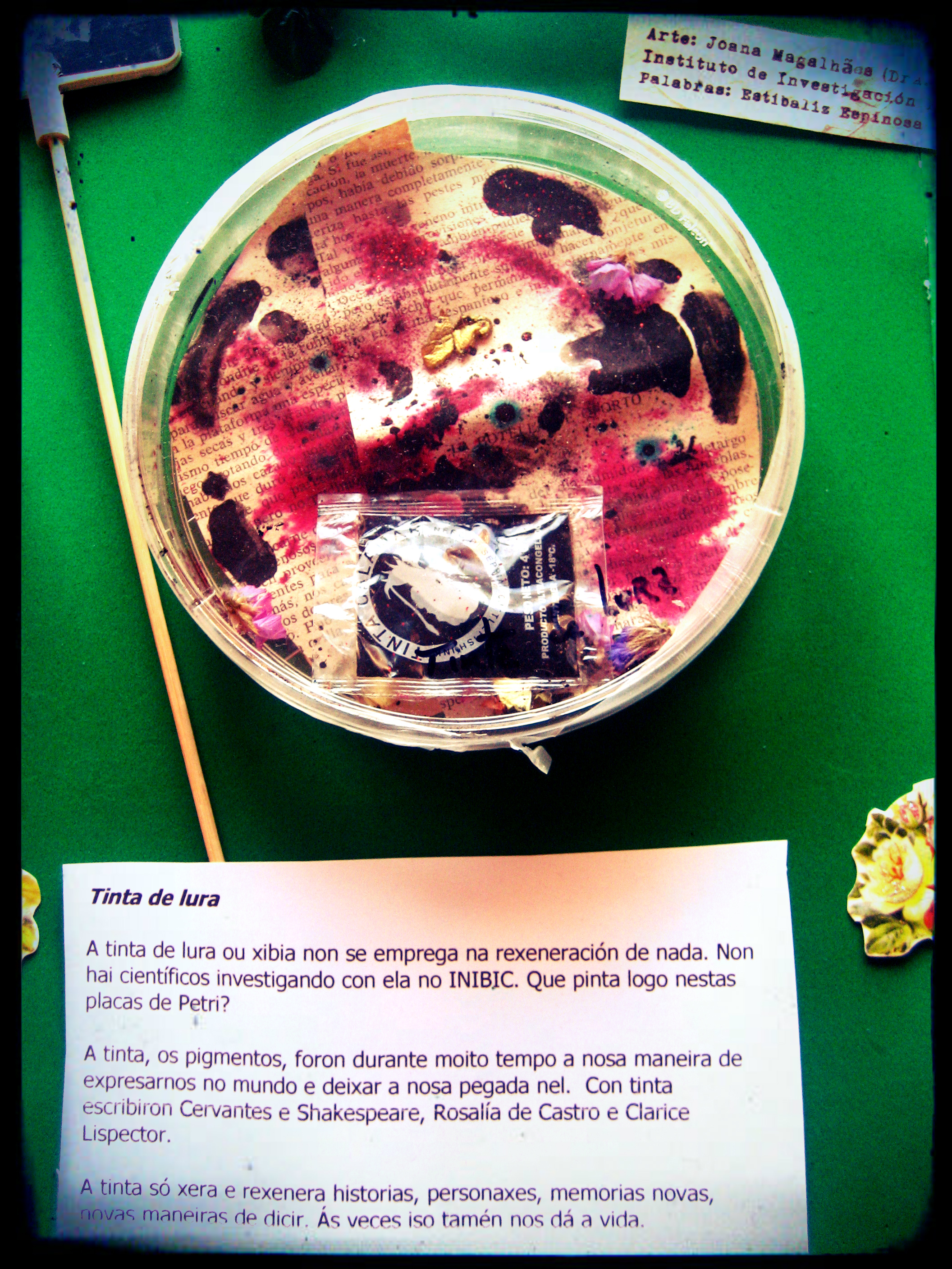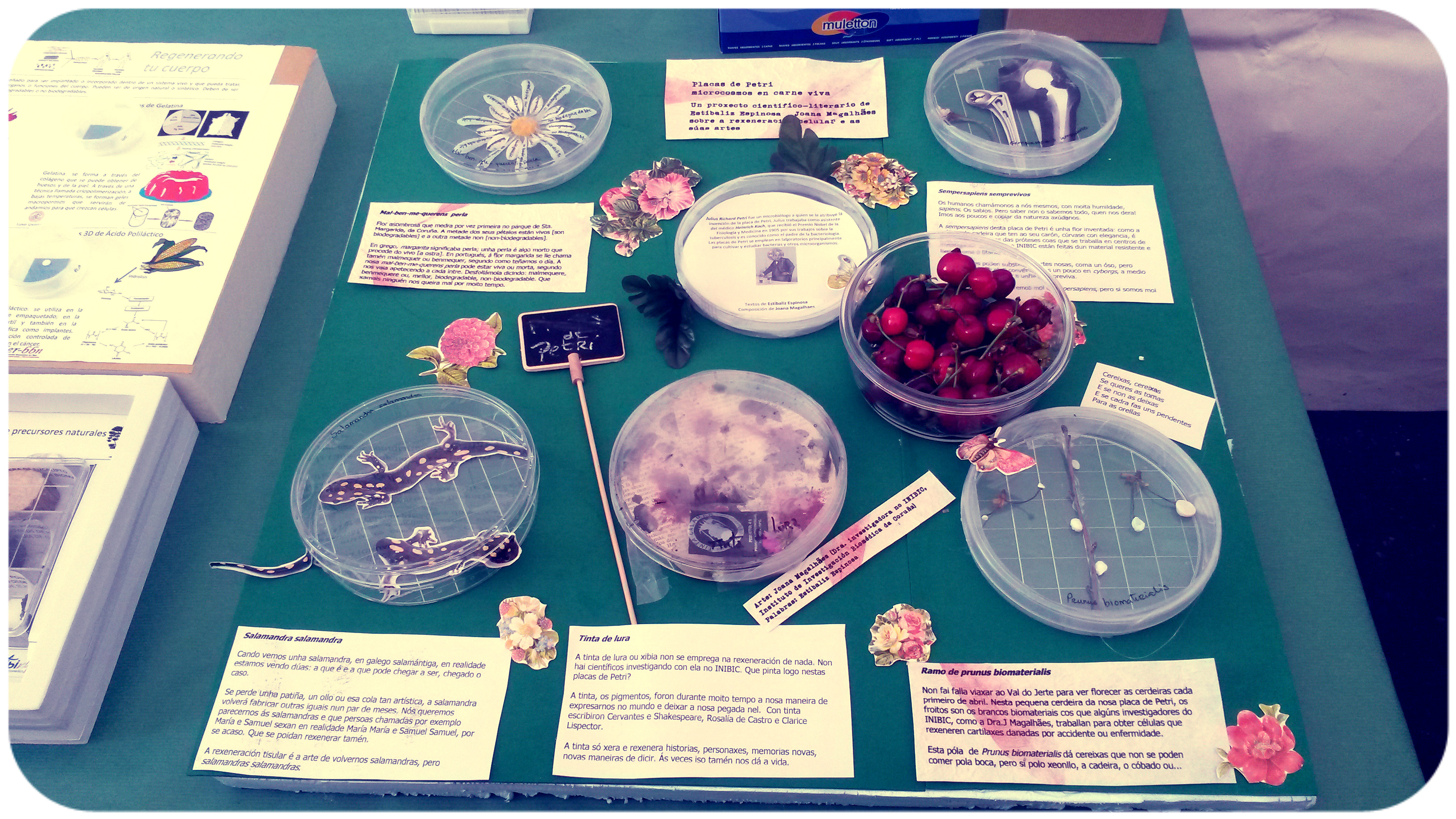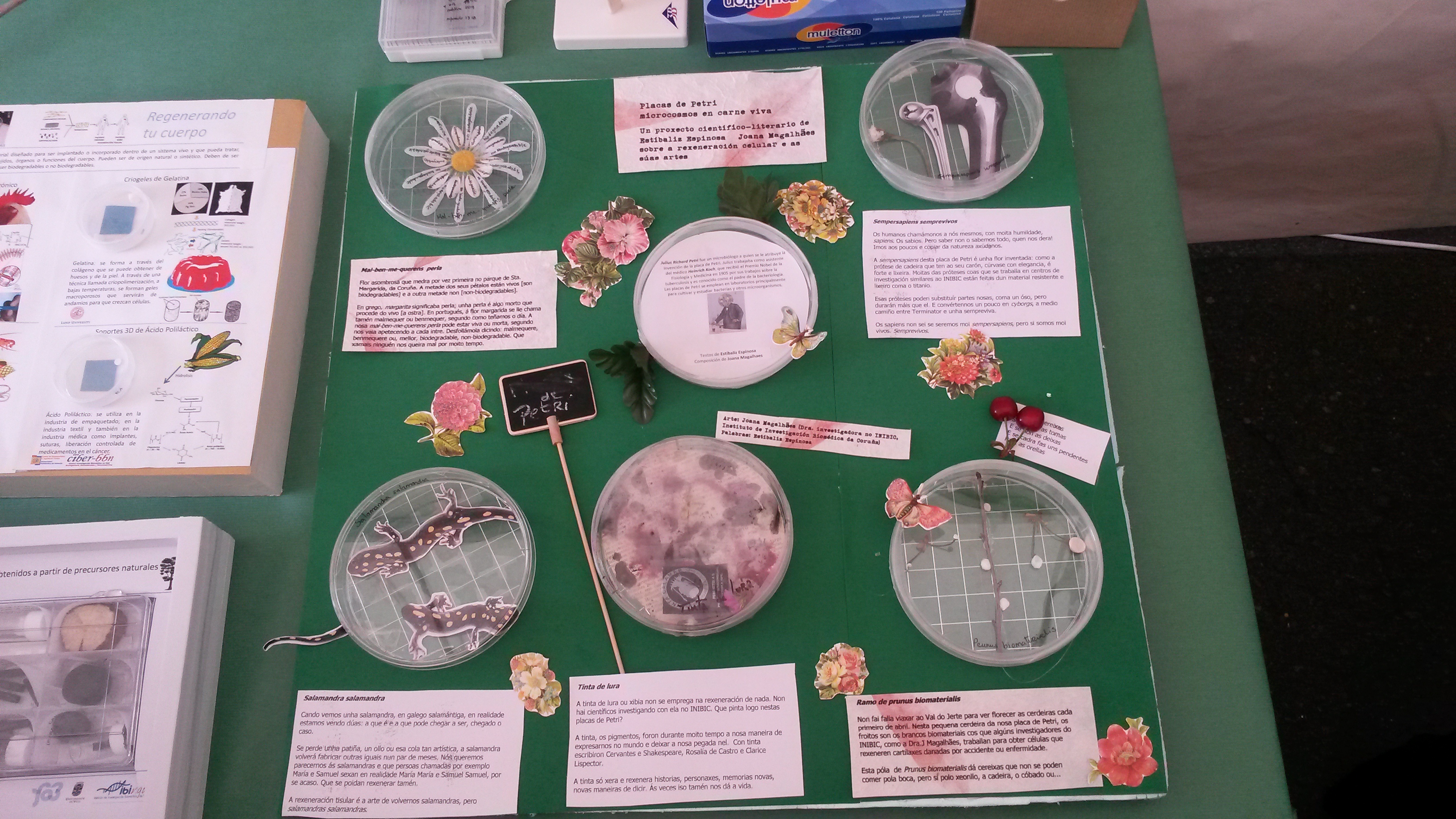 No medio dun exuberante programa de manualidades, piñatas, conferencias e visionado de microscopios, Joana e mais eu presentamos unha serie conxunta de Placas de Petri Inter-vidas: por un lado unha intervención de arte e literatura en 5 placas e por outra a lectura do que chamamos Placas de Petri Sonoras, dous textos relacionados coa xeración de formas de vida, criaturas e tecidos. Estes retransmitíronse en Cuac FM e na Cadena Ser o mesmo día. Os fragmentos escollidos foron retallos e corcosidos de Frankenstein, de Mary Shelley, e un anaco dunha charla de Richard Feynman, titulada O valor da ciencia.