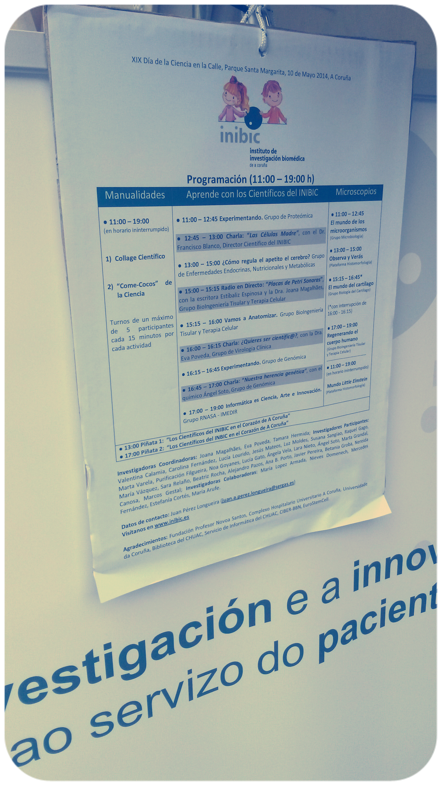 O pasado 10 de maio celebrouse no Parque de Santa Margarida da Coruña o XIX Día da Ciencia na Rúa, cada ano que pasa máis cheo de globos, nenos e música de coches de choque [por favor, por que?]. Asistira como paseanta a moitas das anteriores edicións, pero este ano participei tamén como colaboradora na haima do INIBIC [Instituto de Investigación Biomédica de A Coruña] e podo dicir que nas fotos que me tiraron a última hora parece que me pasara un camión cisterna por riba. E iso que non tiña responsabilidade nin coordinación de haima ningunha, só puña un minúsculo gran de area. Pero resulta tan fascinante como agotador botar alí o día, dou fe.